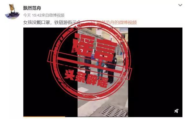 謠言:一則關(guān)于女子戴著手銬指認(rèn)現(xiàn)場(chǎng)的視頻在網(wǎng)上發(fā)布,并且配文稱(chēng):“女子不戴口罩被戴鐵鏈游街示眾”。