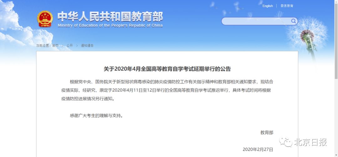 教育部網(wǎng)站2月27日發(fā)布《關于2020年4月全國高等教育自學考試延期舉行的公告》。