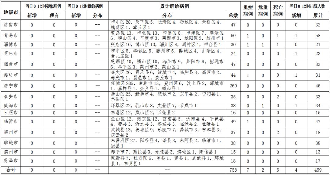 2020年3月2日0-12時(shí),山東省無(wú)新冠肺炎疑似病例;無(wú)新增確診病例,累計(jì)確診病例758例(其中,重癥病例7例,危重癥病例2例,死亡病例6例);新增治愈出院4例,累計(jì)治愈出院459例。截至目前,追蹤到密切接觸者16909人,尚有544人正在接受醫(yī)學(xué)觀察。