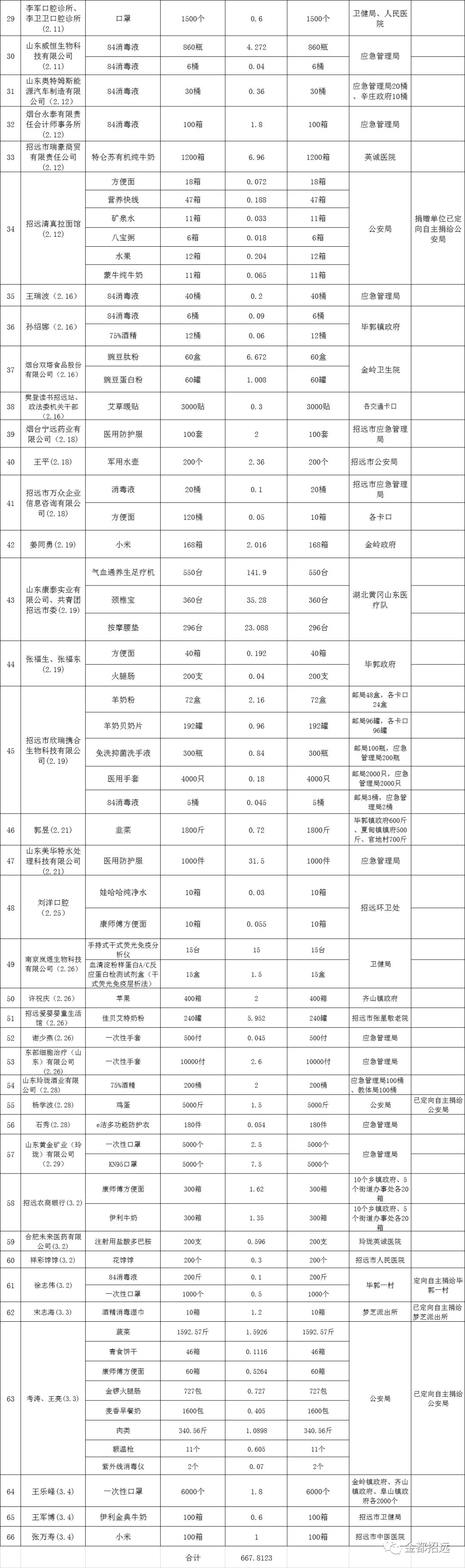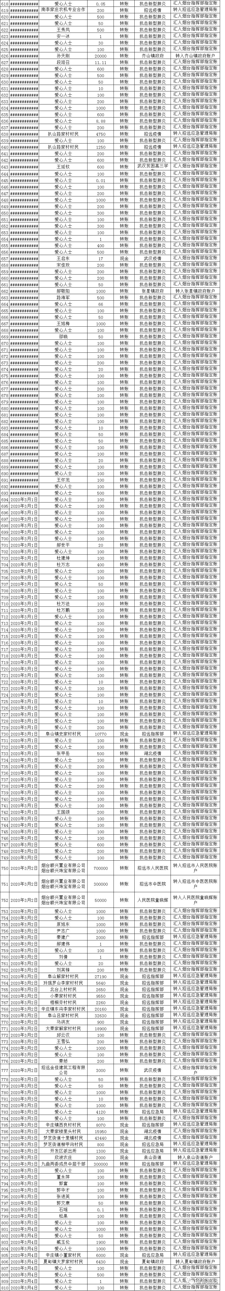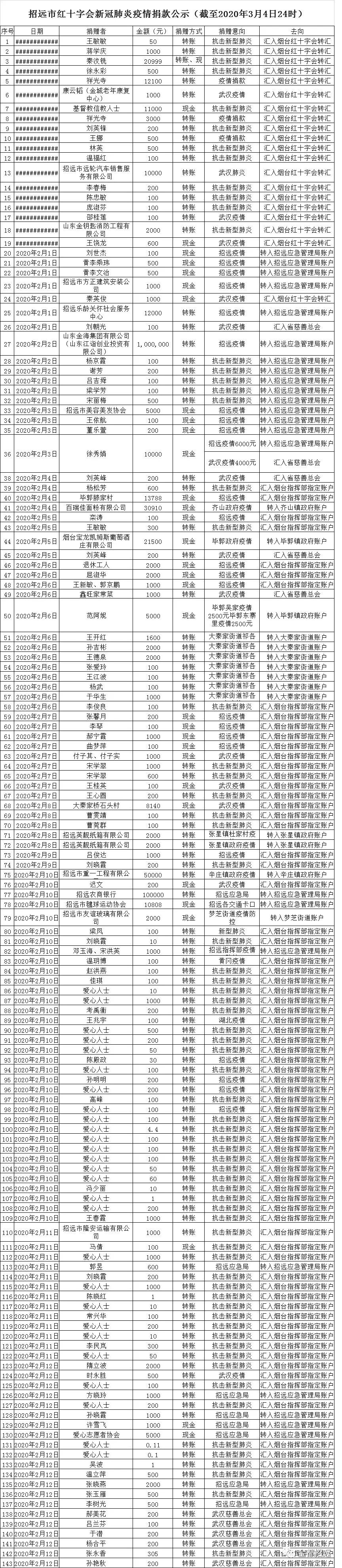 截止到3月4日24時,招遠市紅十字會共計收到愛心企業(yè)、社會組織和個人捐款14477458.35元,接收物資價值合計金額為6678123元。所有捐贈款物,紅十字會都按照捐贈人的意愿,經(jīng)招遠市指揮部批準后轉(zhuǎn)至(匯)各相關單位,無捐贈意向的服從指揮部統(tǒng)一調(diào)配。具體捐贈接收使用分配情況公示如下: