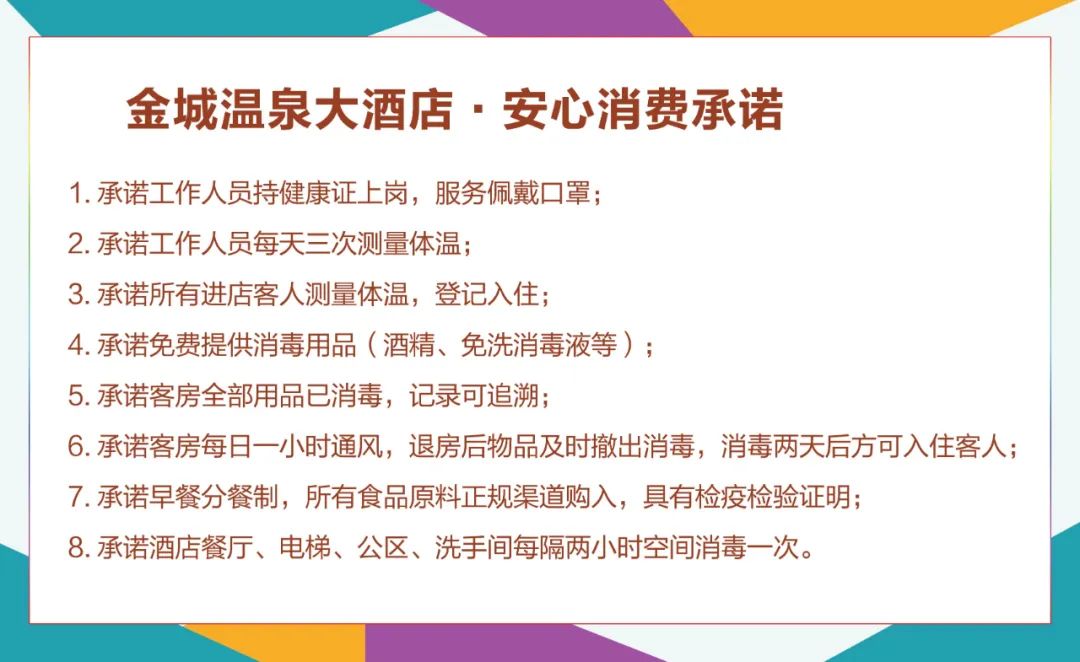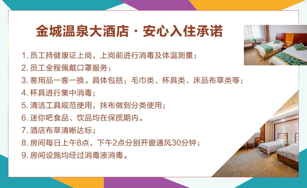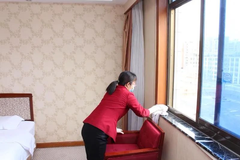 酒店每天嚴(yán)格消殺不少于7次,客房嚴(yán)格執(zhí)行一客一換,每天保持 30 分鐘開窗通風(fēng),退房后床上用品和毛巾等第一時間全部撤出。