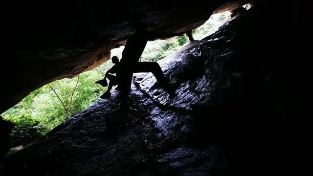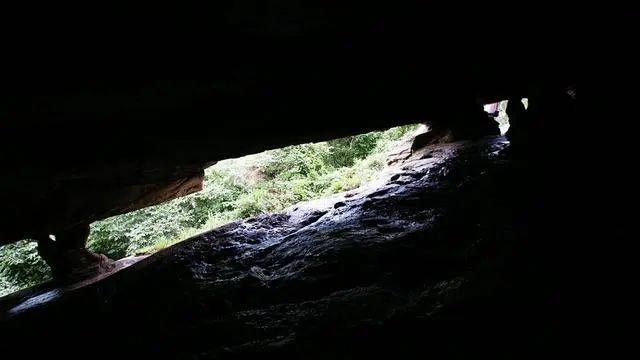 沿著山下的小路蜿蜒數(shù)公里,密林深處有一塊龐大的巨石倒扣在山澗之中,重約百噸,下方凹凸,有一洞口可出入其中,內可容數(shù)十人,高處不過一米左右,形似一座天然的石屋,人在其中是無法站立的,只能蹲著或坐著,石屋被叫做下九間。