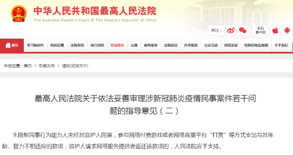 《意見》明確,限制民事行為能力人(8周歲以上的未成年人)未經(jīng)其監(jiān)護人同意,參與網(wǎng)絡(luò)付費游戲或者網(wǎng)絡(luò)直播平臺“打賞”等方式支出與其年齡、智力不相適應(yīng)的款項,監(jiān)護人請求網(wǎng)絡(luò)服務(wù)提供者返還該款項的,人民法院應(yīng)予支持。