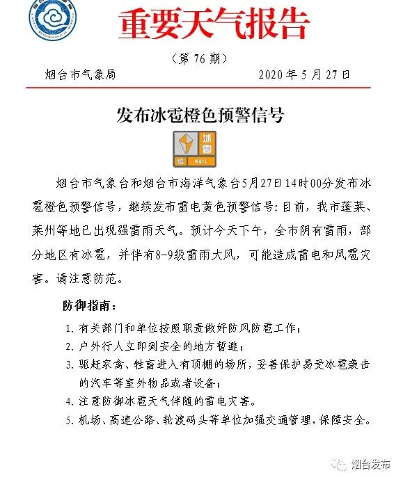 煙臺市氣象臺和煙臺市海洋氣象臺5月27日14時(shí)00分發(fā)布冰雹橙色預(yù)警信號,繼續(xù)發(fā)布雷電黃色預(yù)警信號:目前,我市蓬萊、萊州等地已出現(xiàn)強(qiáng)雷雨天氣。預(yù)計(jì)今天下午,全市陰有雷雨,部分地區(qū)有冰雹,并伴有8-9級雷雨大風(fēng),可能造成雷電和風(fēng)雹災(zāi)害。請注意防范。1. 有關(guān)部門和單位按照職責(zé)做好防風(fēng)防雹工作;3. 驅(qū)趕家禽、牲畜進(jìn)入有頂棚的場所,妥善保護(hù)易受冰雹襲擊的汽車等室外物品或者設(shè)備;5. 機(jī)場、高速公路、輪渡碼頭等單位加強(qiáng)交通管理,保障安全。