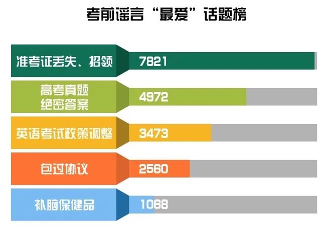 丟準(zhǔn)考證事件每年都有發(fā)生,一方面讓信息真假難辨,迷惑性強,不少網(wǎng)民正出于善于轉(zhuǎn)發(fā),給了謠言可乘之機;另一方面,其較高的出現(xiàn)頻率、舊謠新傳等特點,也為識謠辨謠提供了契機。中國互聯(lián)網(wǎng)聯(lián)合辟謠平臺對近3年此類謠言進行梳理,歸納出此類謠言高頻詞,看到它們,就別轉(zhuǎn)了!