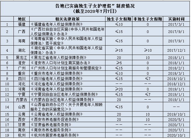 此外,遼寧、甘肅、云南等省份雖然還未出臺“獨生子女護理假”具體規(guī)定,但也提出探索建立獨生子女護理假制度。