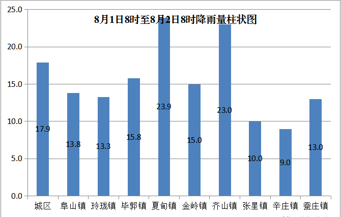受副高邊緣暖濕氣流影響,8月1日8時至8月2日8時,全市發(fā)生一次降水過程。據(jù)市水文局統(tǒng)計,全市平均降水量15.5毫米。其中城區(qū)17.9毫米、夏甸鎮(zhèn)23.9毫米、齊山鎮(zhèn)23.0毫米、畢郭鎮(zhèn)15.8毫米、金嶺鎮(zhèn)15.0毫米、阜山鎮(zhèn)13.8毫米、玲瓏鎮(zhèn)13.3毫米、蠶莊鎮(zhèn)13.0毫米、張星鎮(zhèn)10.0毫米、辛莊鎮(zhèn)9.0毫米。全市最大點降水量:夏甸鎮(zhèn)東莊雨量站33.0毫米。