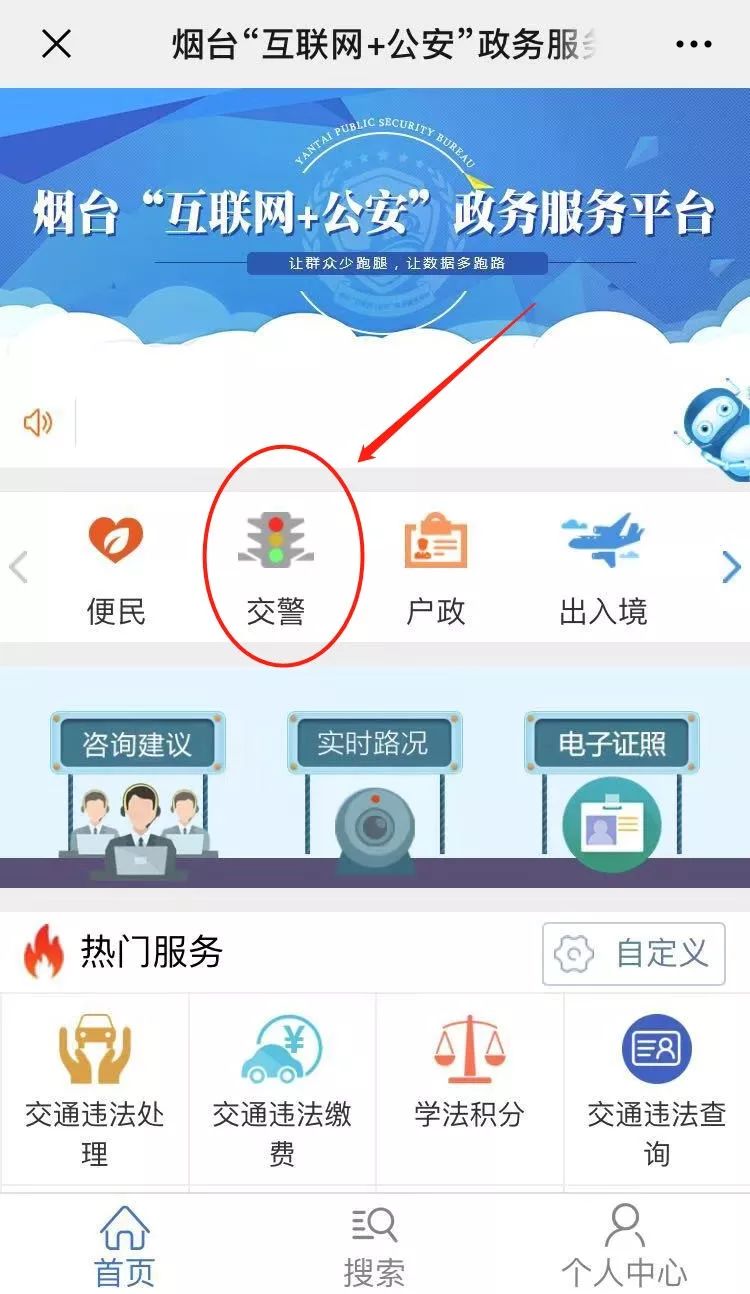⑴打開“煙臺(tái)交警”或“煙臺(tái)公安”微信公眾號(hào)。