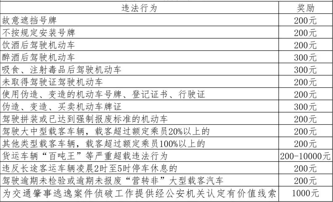1、舉報(bào)故意遮擋號(hào)牌、不按規(guī)定安裝車輛號(hào)牌獎(jiǎng)勵(lì)200元,原有嚴(yán)重違法行為舉報(bào)獎(jiǎng)勵(lì)金額不變。