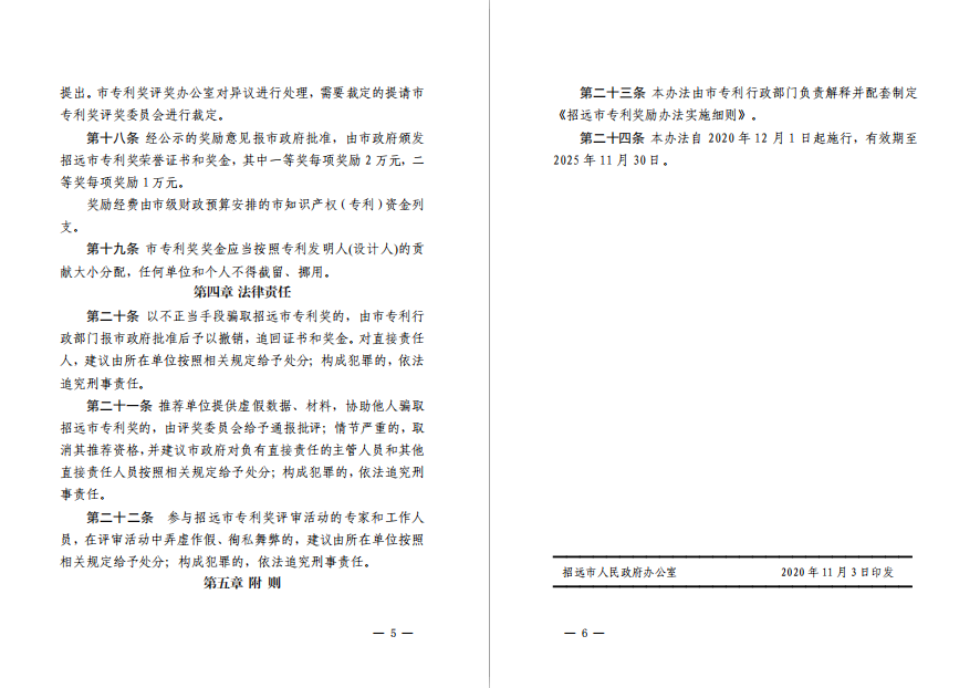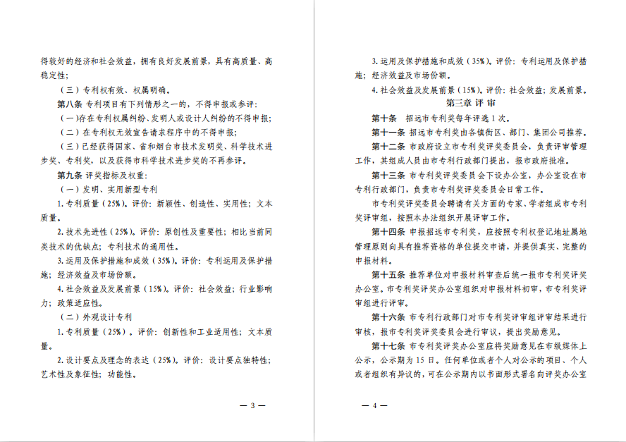 專利工作作為激勵創(chuàng)新的有力保障,在提高企業(yè)核心競爭力和推動新舊動能轉(zhuǎn)換中發(fā)揮著重要作用,對實施知識產(chǎn)權(quán)戰(zhàn)略、促進(jìn)專利技術(shù)運用、推動全市高質(zhì)量發(fā)展具有積極的推動作用。市政府設(shè)立專利獎,用于獎勵在招遠(yuǎn)市行政區(qū)域內(nèi)發(fā)明創(chuàng)造水平高,已經(jīng)實施并產(chǎn)生顯著經(jīng)濟(jì)和社會效益,具有良好發(fā)展前景的優(yōu)秀專利。