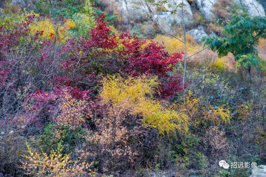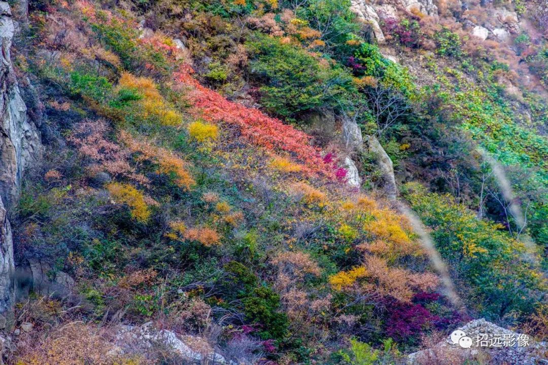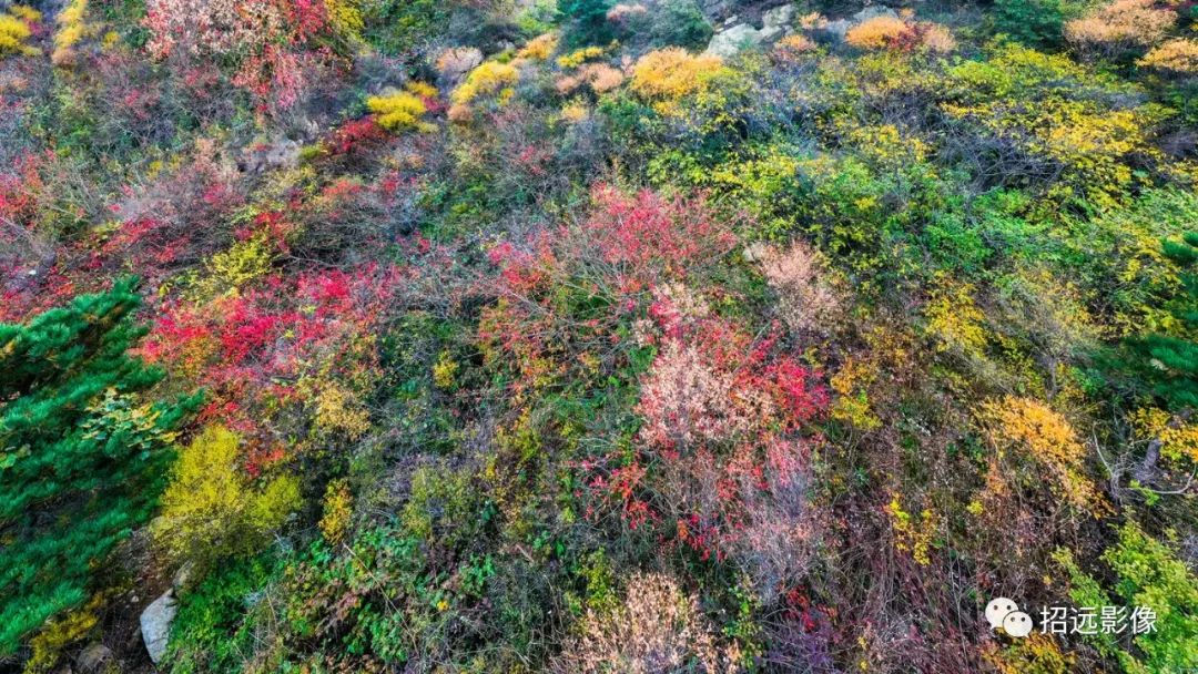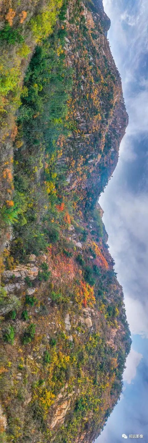 招遠的秋天,藍天白云,層林盡染,