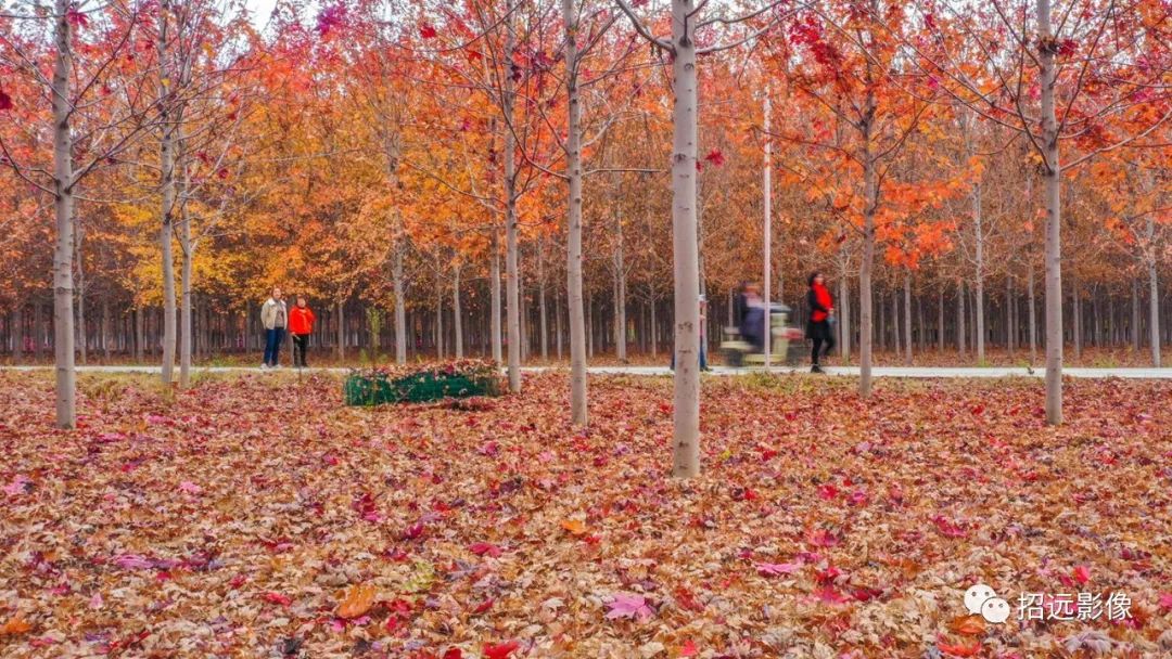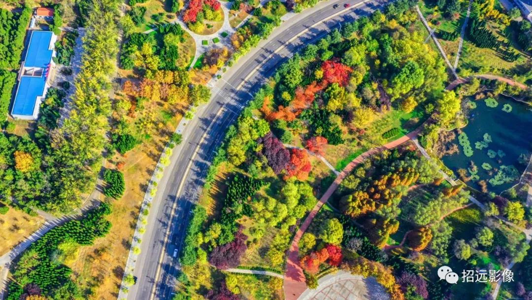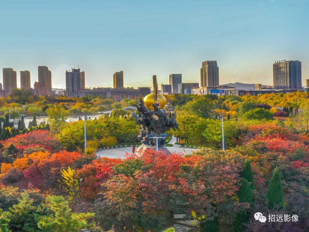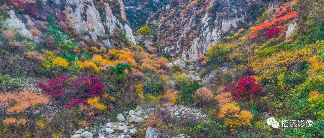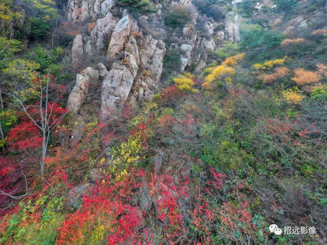 招遠的秋天,藍天白云,層林盡染,