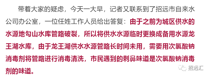 所以,近期招遠(yuǎn)市的自來水需要居民們放水一定時間后再使用。另外,如果不喜歡水中的氯味,也就是消毒水味,建議居民接自來水,然后將水倒在敞開的容器里放置一天,這樣氯味就會揮發(fā)掉。