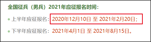 上半年應(yīng)征報(bào)名:普通高等學(xué)校全日制應(yīng)屆畢業(yè)生及在校生,年滿18至22周歲;2020年普通高等學(xué)校全日制應(yīng)屆畢業(yè)生可以報(bào)名參加2021年上半年女兵征集,年齡放寬至23周歲。