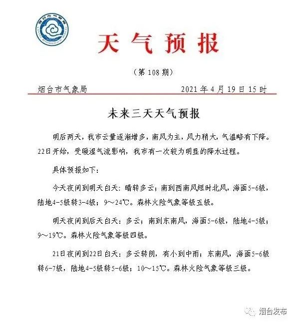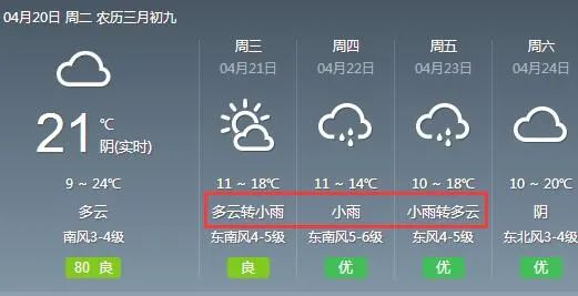 明后兩天,我市云量逐漸增多,南風(fēng)為主,風(fēng)力稍大,氣溫略有下降。22日開始,受暖濕氣流影響,我市有一次較為明顯的降水過程。