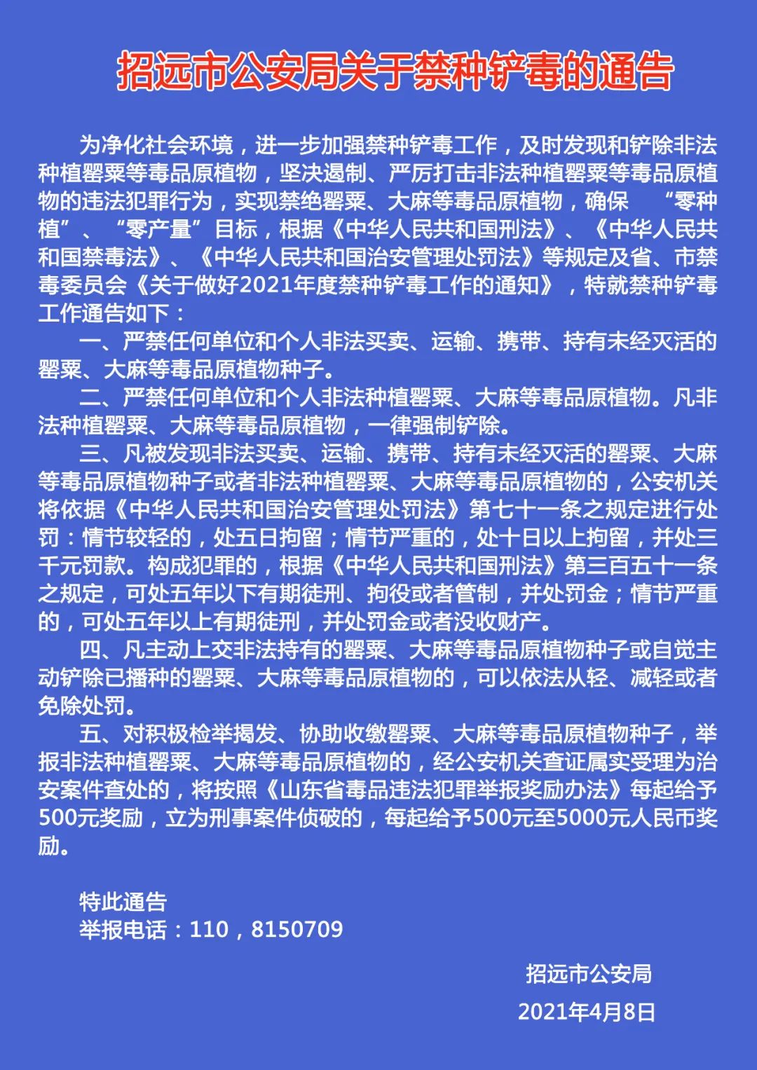 某地派出所接群眾舉報,轄區(qū)村民楊某非法種植罌粟,民警到達現場后依法進行鏟除,經清點楊某共種植罌粟1032棵。