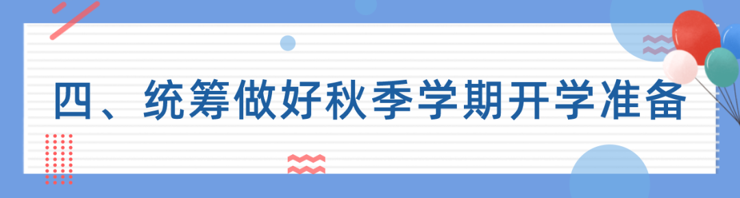 各級(jí)教育行政部門和學(xué)校要做好假期校舍管理,落實(shí)值班制度,完善防汛及應(yīng)對(duì)極端天氣舉措。要利用假期做好校舍安全檢修、改造加固等工作,精心做好開學(xué)前各項(xiàng)準(zhǔn)備工作,確保新學(xué)期教育教學(xué)正常順利開展。要切實(shí)按照疫情常態(tài)化防控工作要求,密切關(guān)注疫情防控形勢(shì),切實(shí)指導(dǎo)學(xué)生、家長(zhǎng)、教職員工合理安排假期出行及開學(xué)前準(zhǔn)備工作。