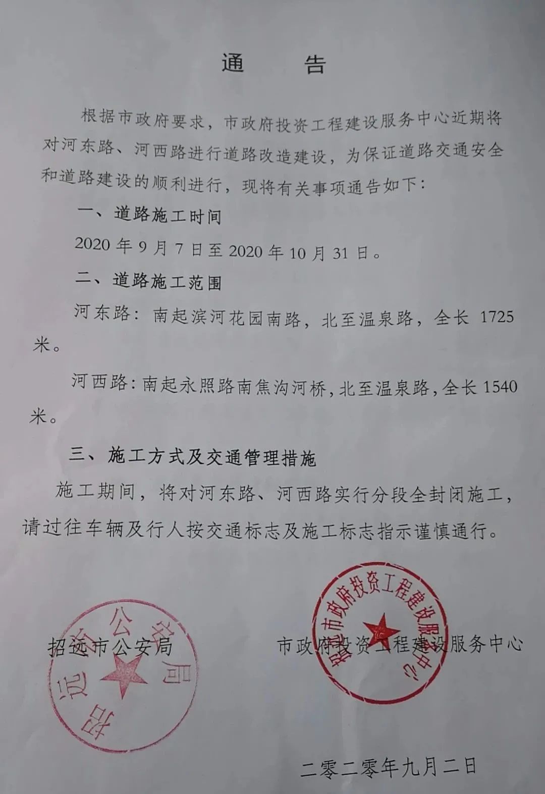 全宇宙只有不到1%的人點(diǎn)擊上方進(jìn)入招遠(yuǎn)信息港你真是個(gè)特別的人通告經(jīng)市政府批準(zhǔn),將于近期對我市河西路進(jìn)行道路改造建設(shè),為確保施工期間的道路暢通,現(xiàn)將有關(guān)情況通告如下:一、道路施工時(shí)間2020年10月11